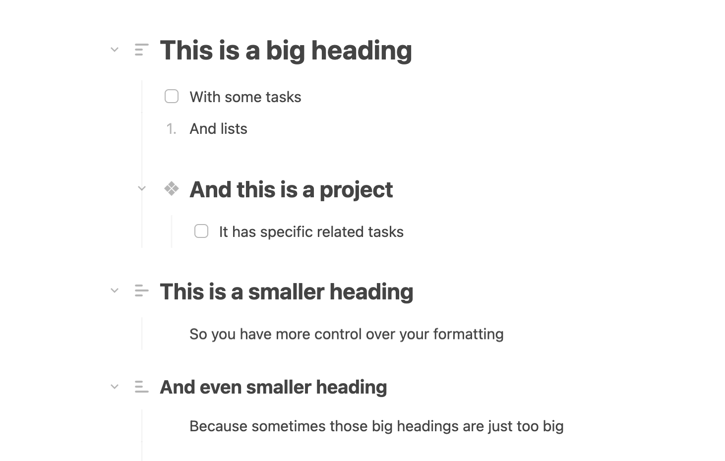This was highly requested so that people could use Headings for more control over formatting and structure, while Projects could be used for specific items for visual differentiation, and for another dimension to group and filter by. But as with most things in Legend, you're free to find your own interesting ways to use this, and we'd love to hear your ideas!